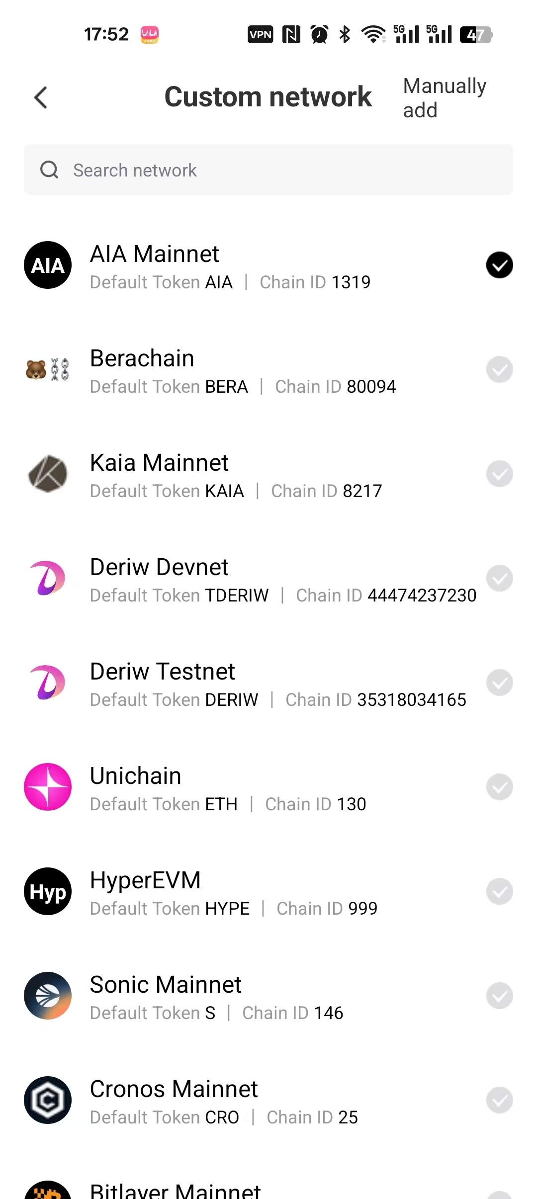 - Alternatively, use the "Manually add" button in the top-right corner of the full list to customize a new network.