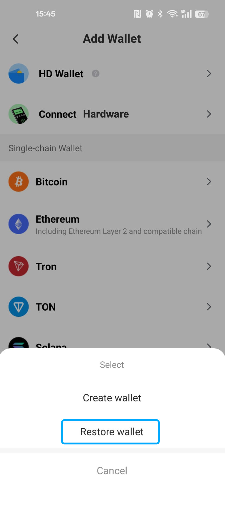 - Choose between an Identity Wallet (multi-chain) or a Single-Network Wallet, then select 【Restore Wallet】 from the options.