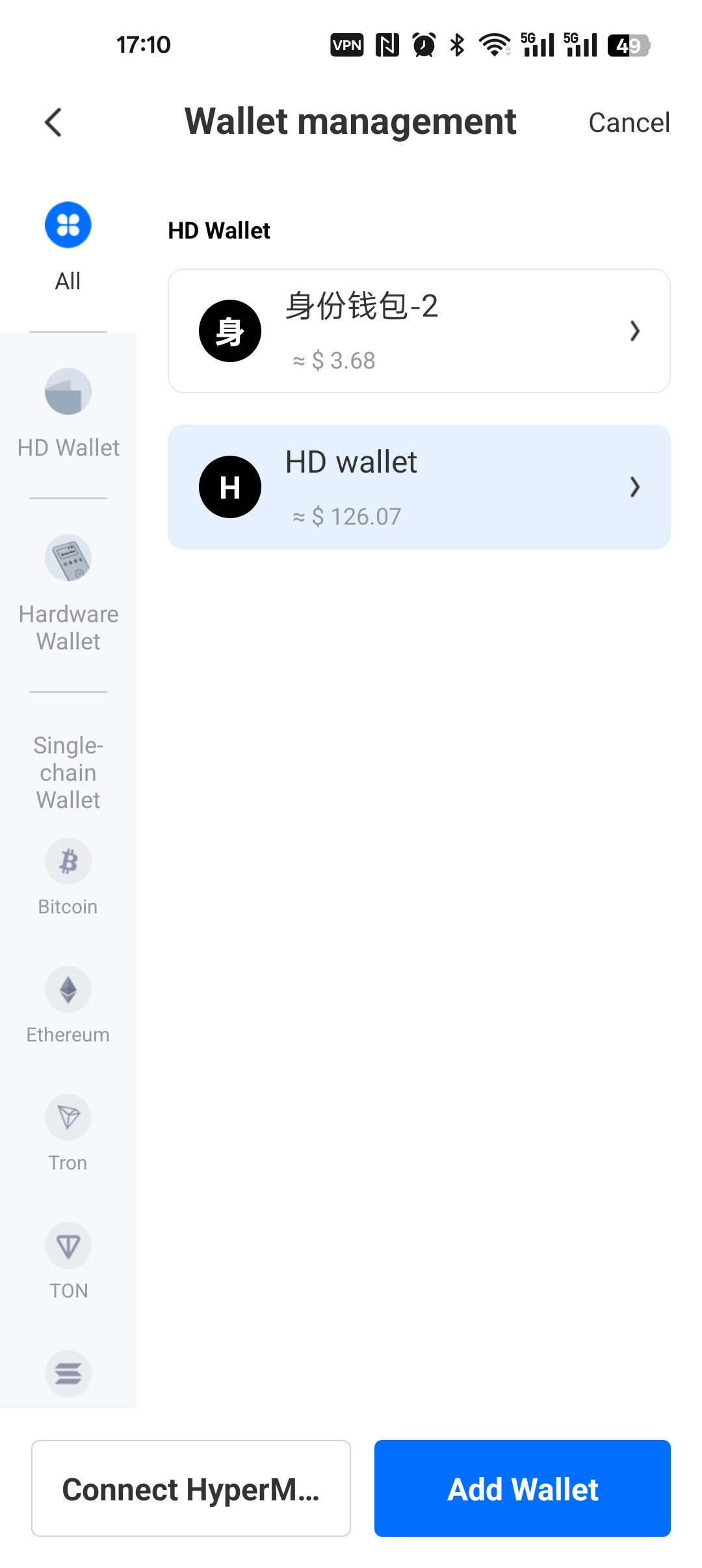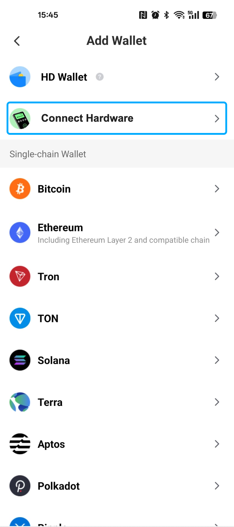 - Click 【Connecting Hardware】 at the bottom of the wallet list page, or select 【Connecting Hardware】 on the "Add Wallet" page.