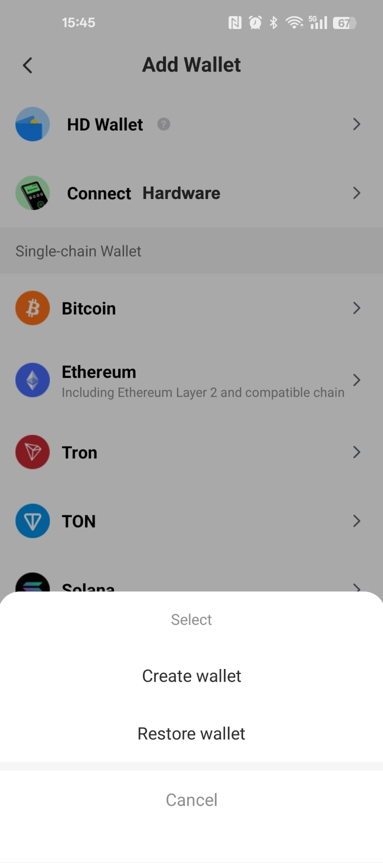 - Tap the "+" button and select 【Add Wallet】 to open the addition options.