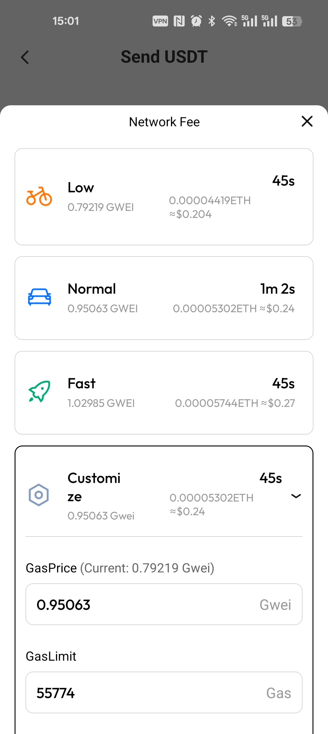 自定义Gas Fee hpx center 2025年09月01日 09:29 更新 在进行EVM、BTC等支持自定义燃料费的网络转账时,透过下面方法来自定义gas费用。。在转账确认页,点选矿工费用进入gas弹出设定页面。在网络费用设定弹出框点击自定义来设定你想支付的网络费用,建议不要明显低于默认值,以免交易失败。 image.png 200 KB 下载 image.png 200 KB 下载 image.png 300 KB 下载 评论 0 条评论 请登录写评论。