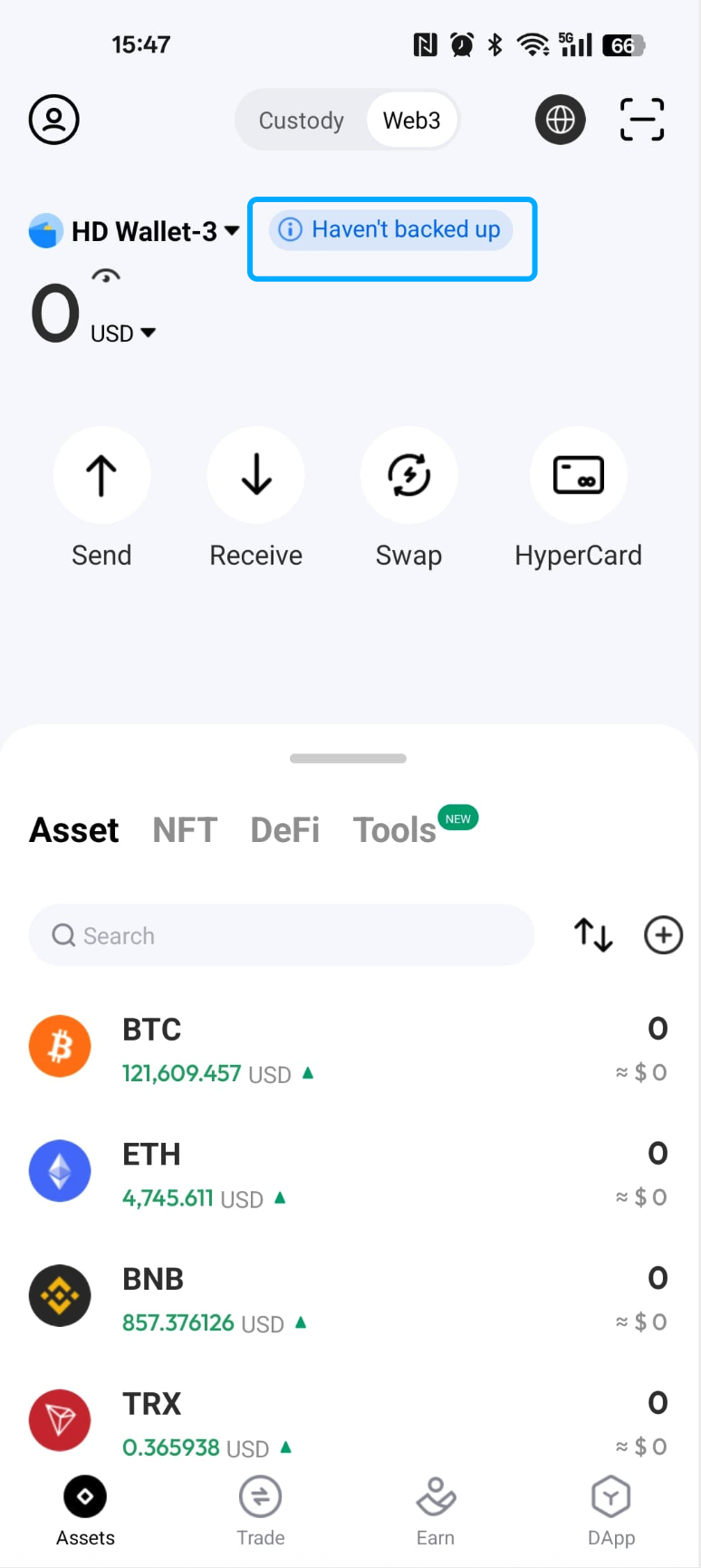 - 对于刚创建的新钱包还没做助记词备份,请点击新钱包首页备份提示尽快进行助记词备份