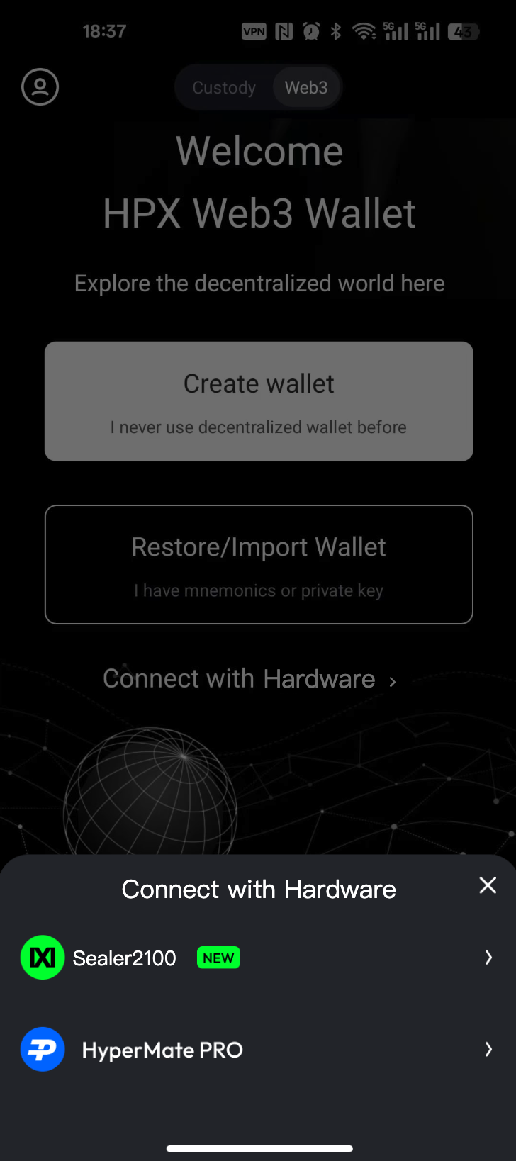 - 启动 HPX Wallet App,进入Web3 钱包,然后选择「连接硬件钱包 (Connect with Hardware)」。