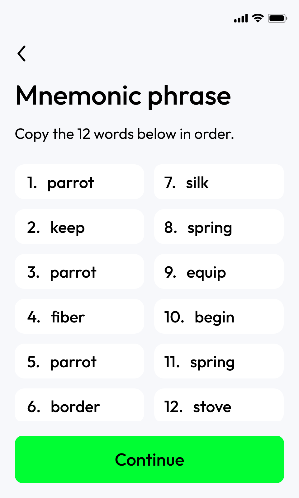 - 重复该过程直到记录完最后一个助记词,并确保已正确抄写每一个助记词。