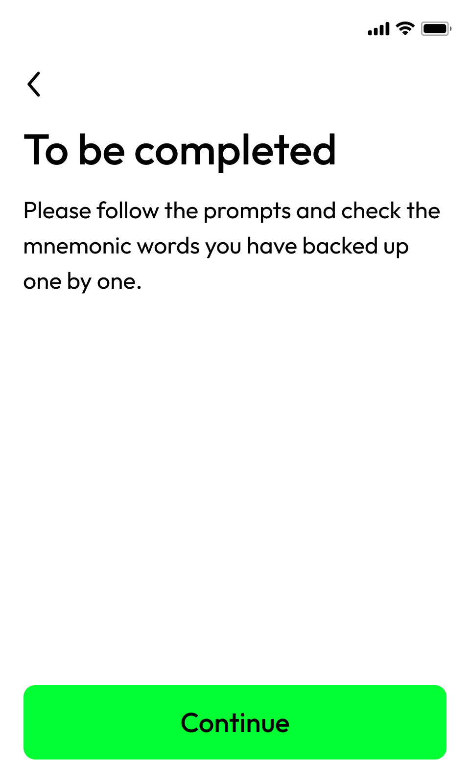 - 当屏幕显示即将完成时,按「继续 (Continue)」 进入验证助记词短语的步骤。