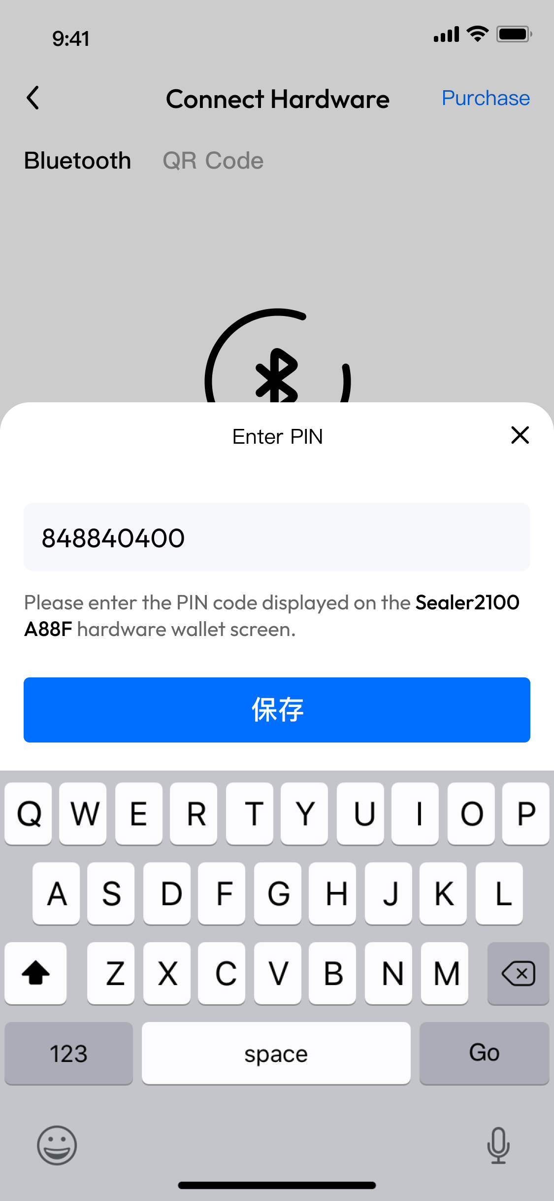 - 在HPX App上输入Sealer2100 硬件上显示的蓝牙匹配PIN 码。